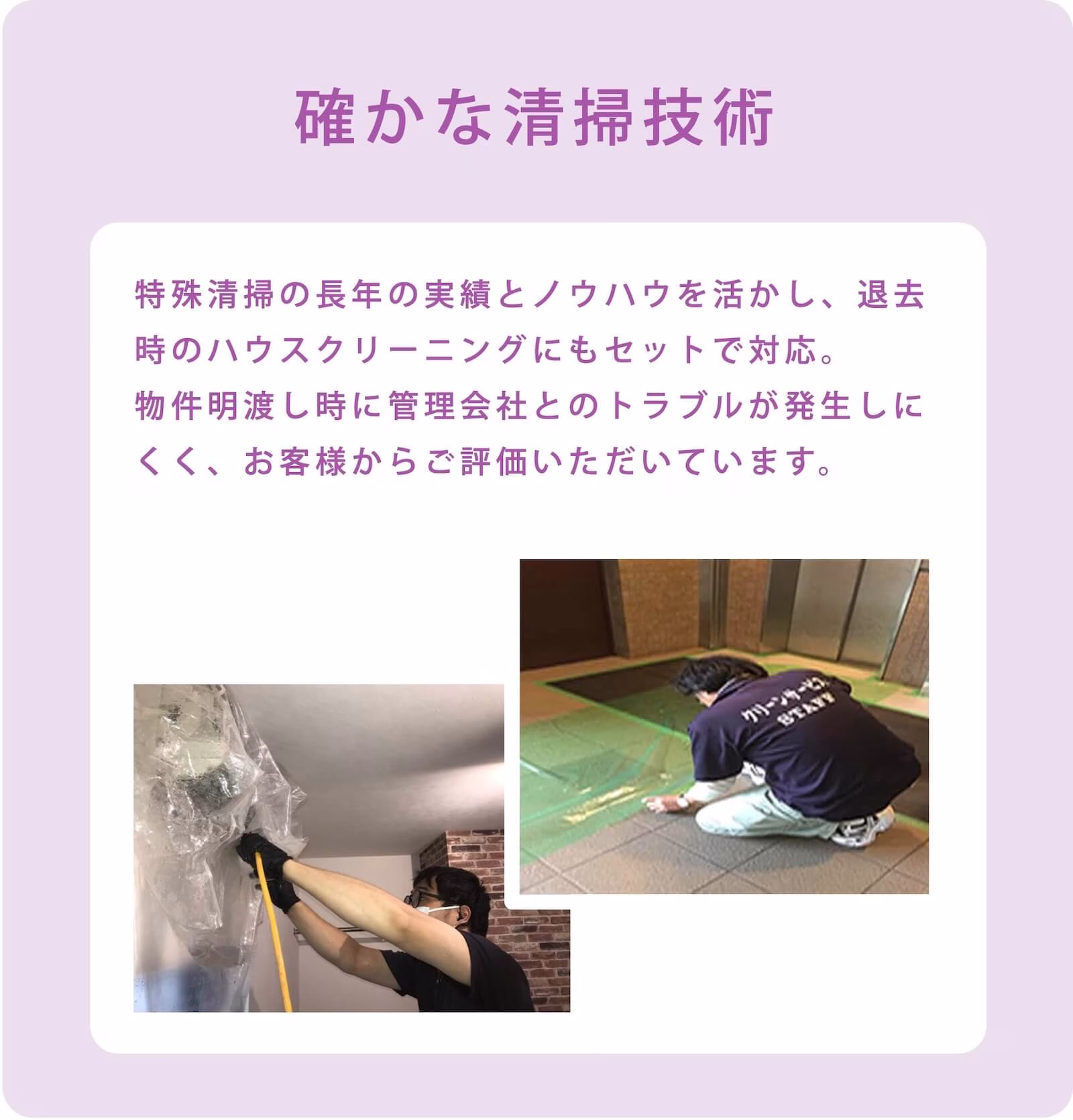 クリーンサービスが長年の現場経験で、単なる作業技術をご提供するだけでなく、ご依頼者様とオーナー様の双方が気持ちよく賃貸契約を終えられるための対応の大切さも、現場を通じて学ばせていただきました。