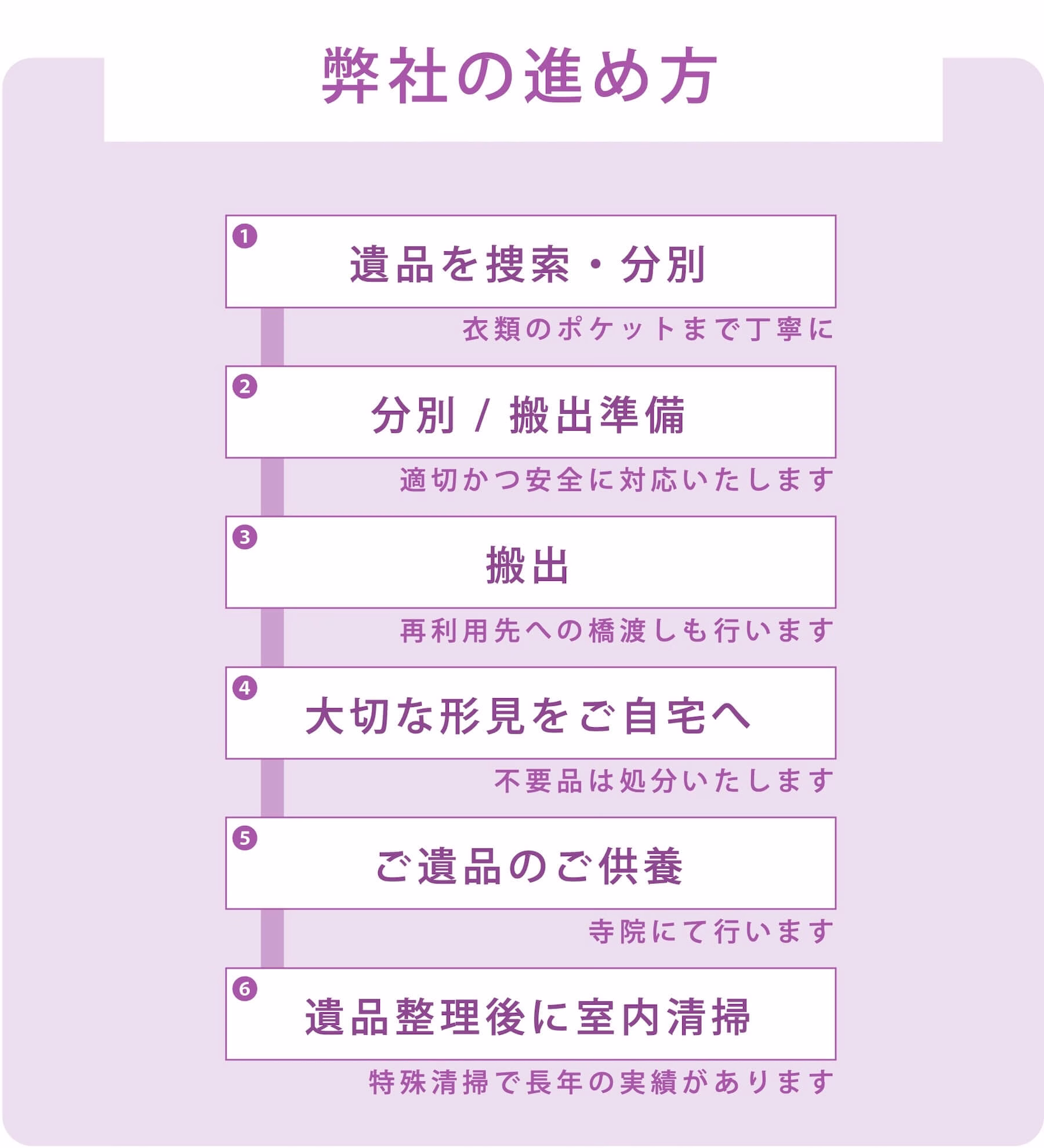 遺品整理は、ただ物を片付ける作業ではなく、ゆとりをもって、心を整える大切な時間でもあります。ご遺族の状況や規模に応じて、「遺品整理」サービスを無理のない選択肢としてご検討いただくのも良いでしょう。