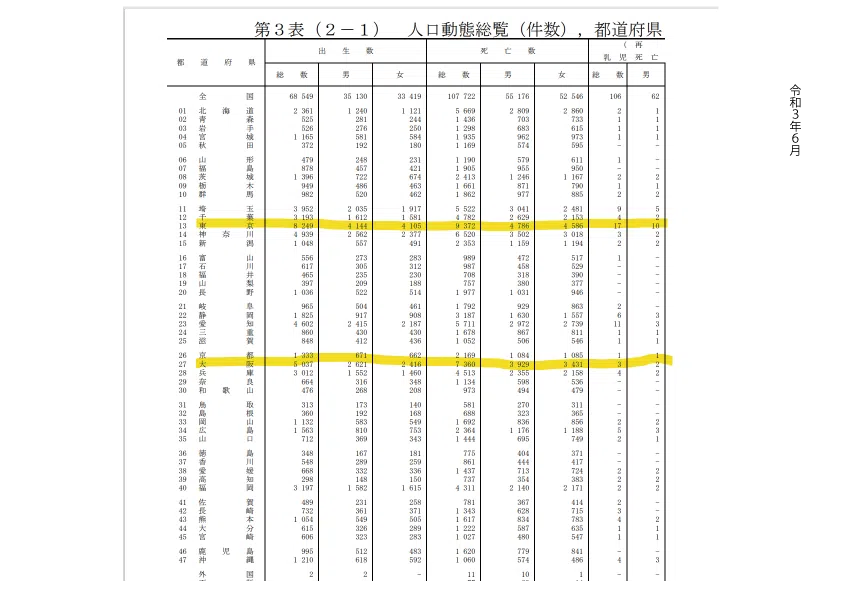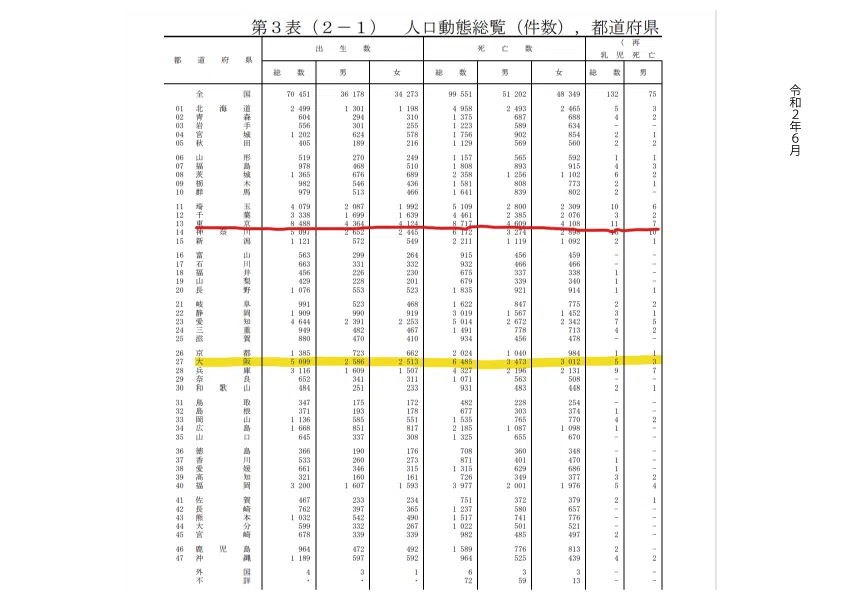 令和2年6月と令和3年の6月をくらべてみると単月だけでは東京は8000人もの方が亡くなっていますがそれほど倍には死亡者は増えてはいません。大阪でも6000人もの方が6月に亡くなっておりますが倍の人数にはなっていません。