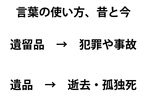 ですので、言葉の使い方によっては事件性がなく病院でご逝去されたばあいなどのひとには遺留品処分ではなく遺品処分のほうが好ましいとなります。