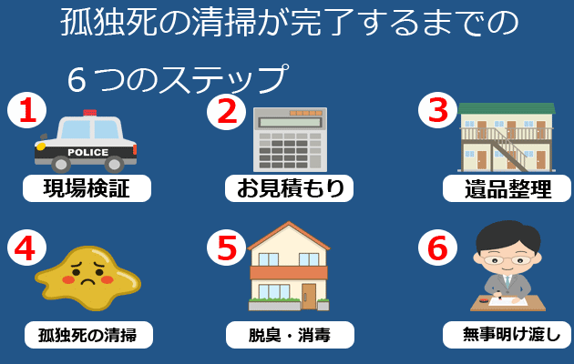 賃貸物件の場合には次の入居者のためにリフォームをしなければなりませんが、孤独死の体液の清掃と脱臭作業は遺品整理専門の業者に依頼するようにしましょう。そして遺品整理から清掃消毒までの流れをご紹介します。